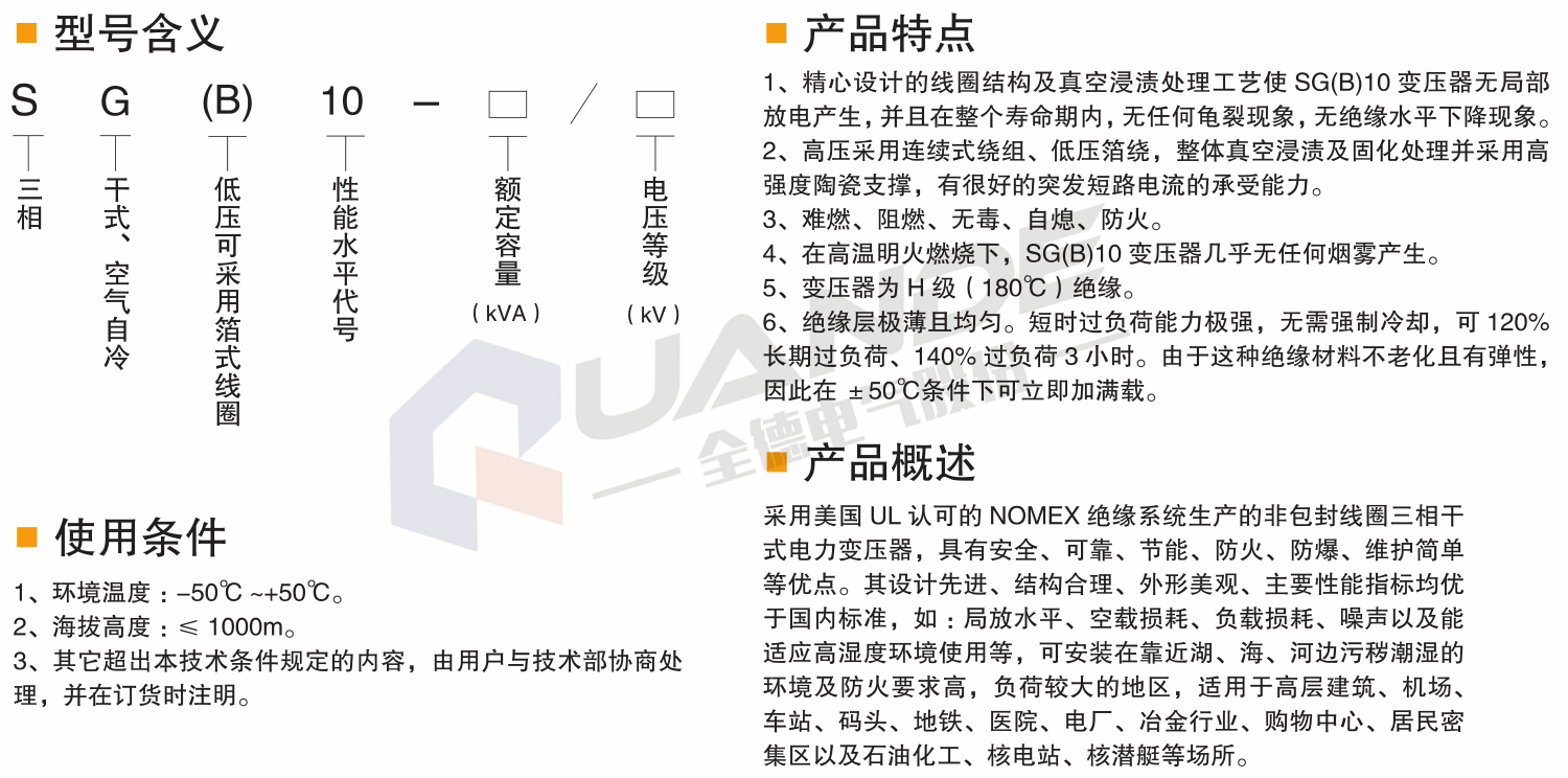 采用美國UL認可的NOMEX絕緣系統生產的非包封線圈三相干式電力變壓器,具有安全、可靠、節能、防火、防爆、維護簡單等優點。其設計先進、結構合理、外形美觀、主要性能指標均優于國內標準,如:局放水平、空載損耗、負載損耗、噪聲以及能適應高濕度環境使用等,可安裝在靠近湖、海、河邊污穢潮濕的環境及防火要求高,負荷較大的地區,適用于高層建筑、機場、車站、碼頭、地鐵、醫院、電廠、冶金行業、購物中心、居民密集區以及石油化工、核電站、核潛艇等場所。